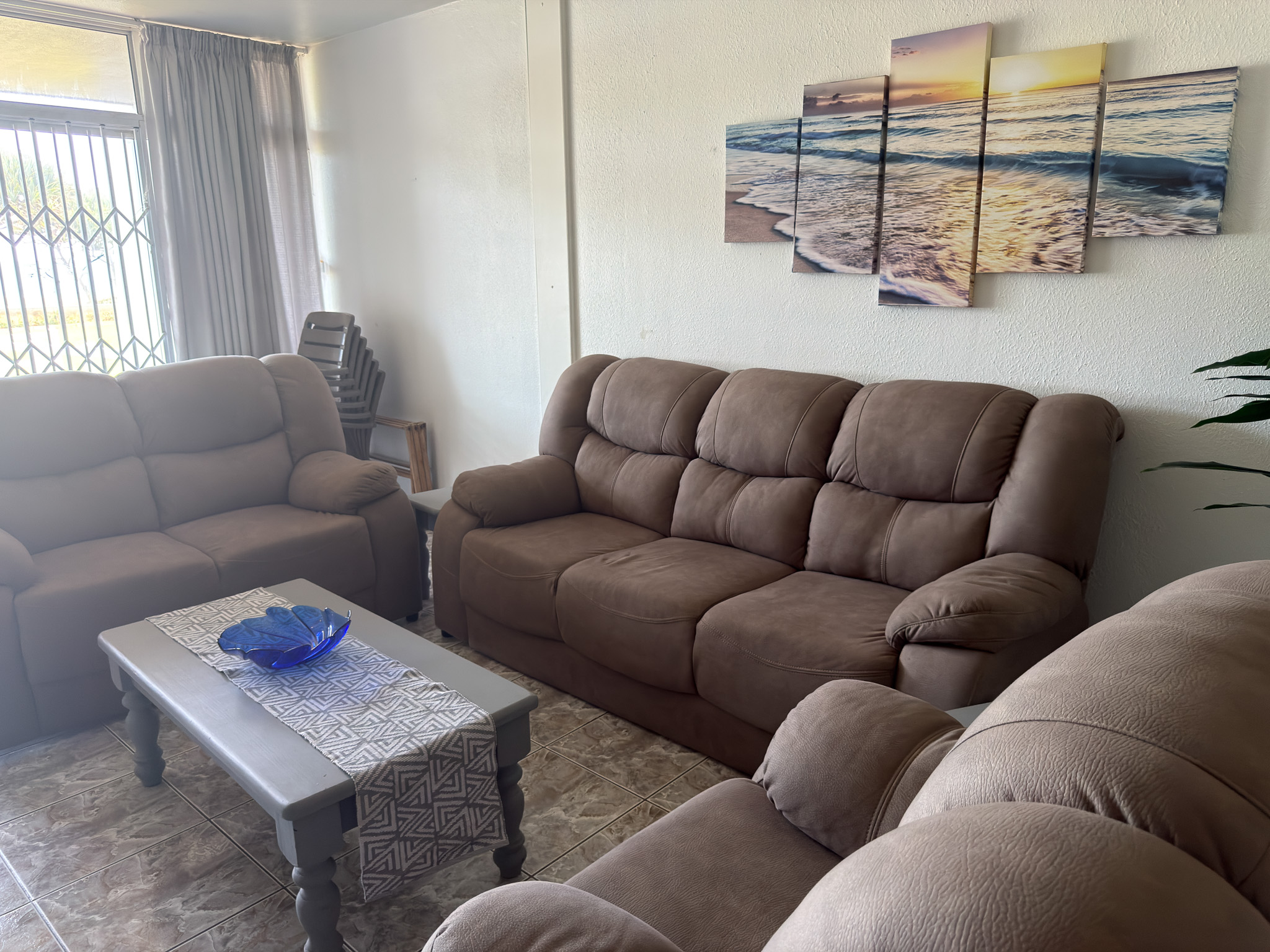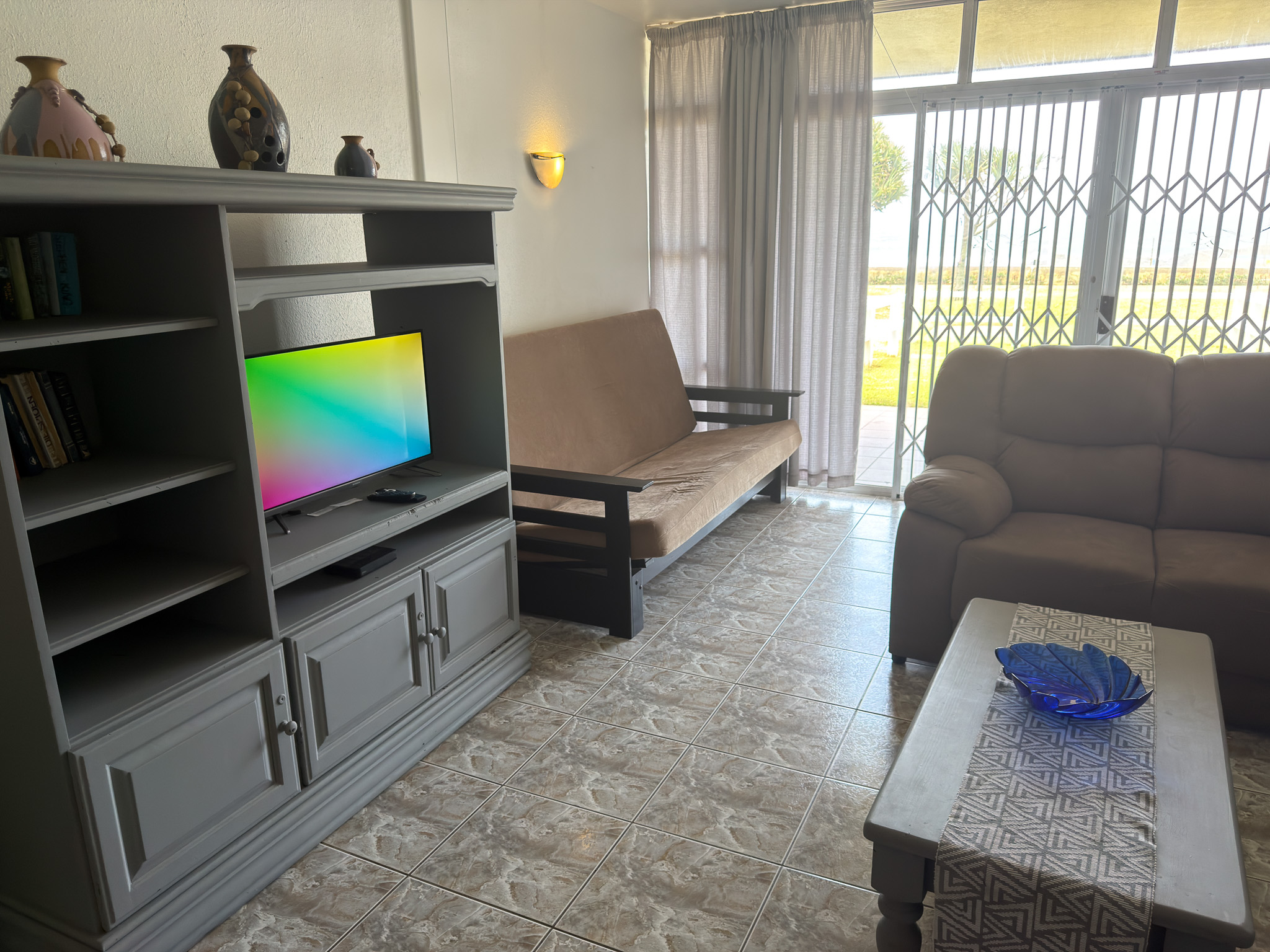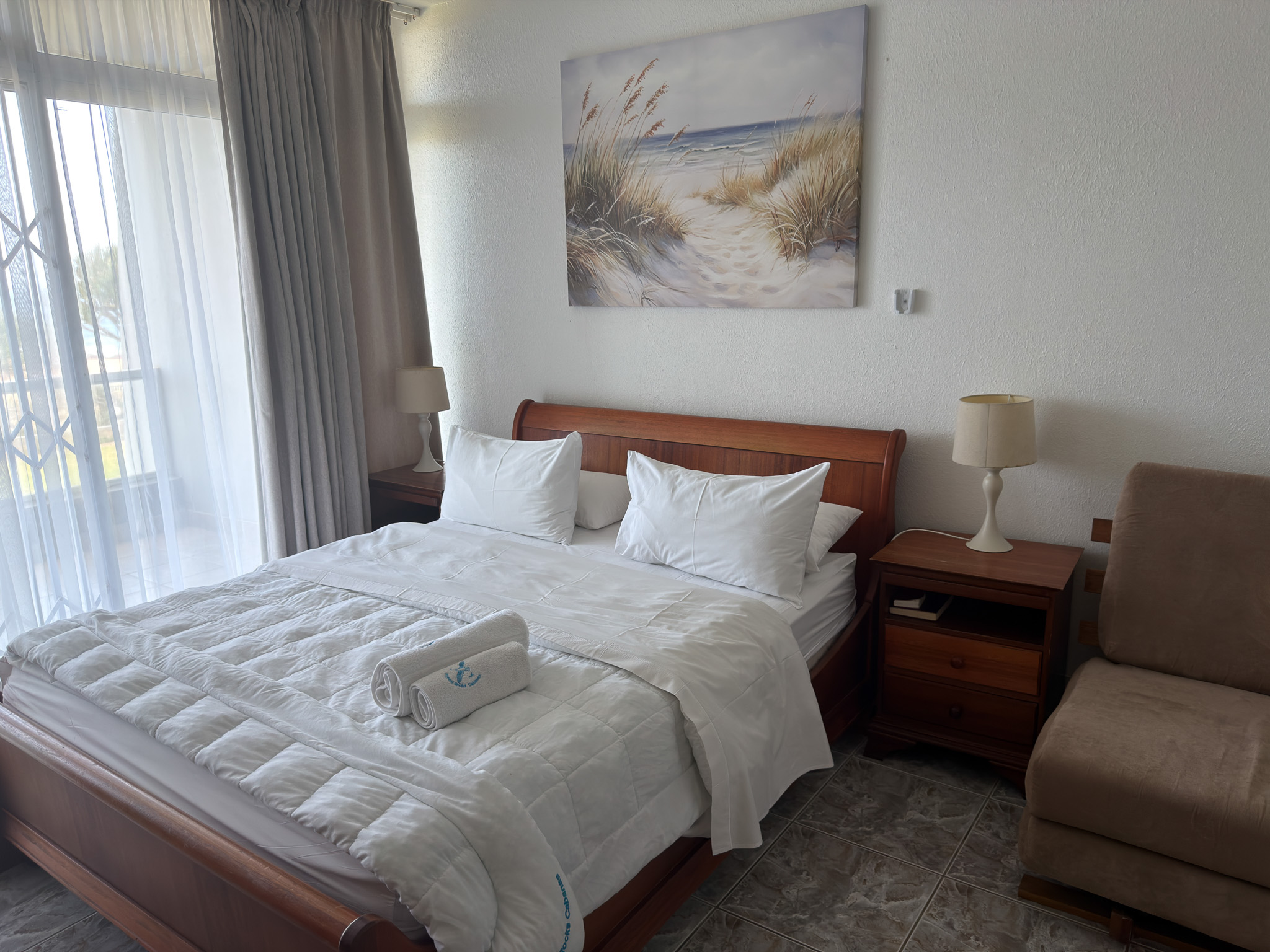 Individually owned and uniquely decorated 2-bedroom sea-facing apartment on the ground floor at Inyoni Rocks Cabanas. Sleeps up to 6 guests. Features a fully equipped kitchen, DSTV & WiFi, private balcony, and en-suite main bedroom. All linen included.