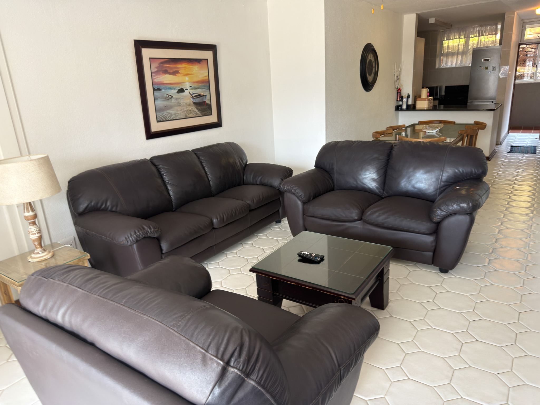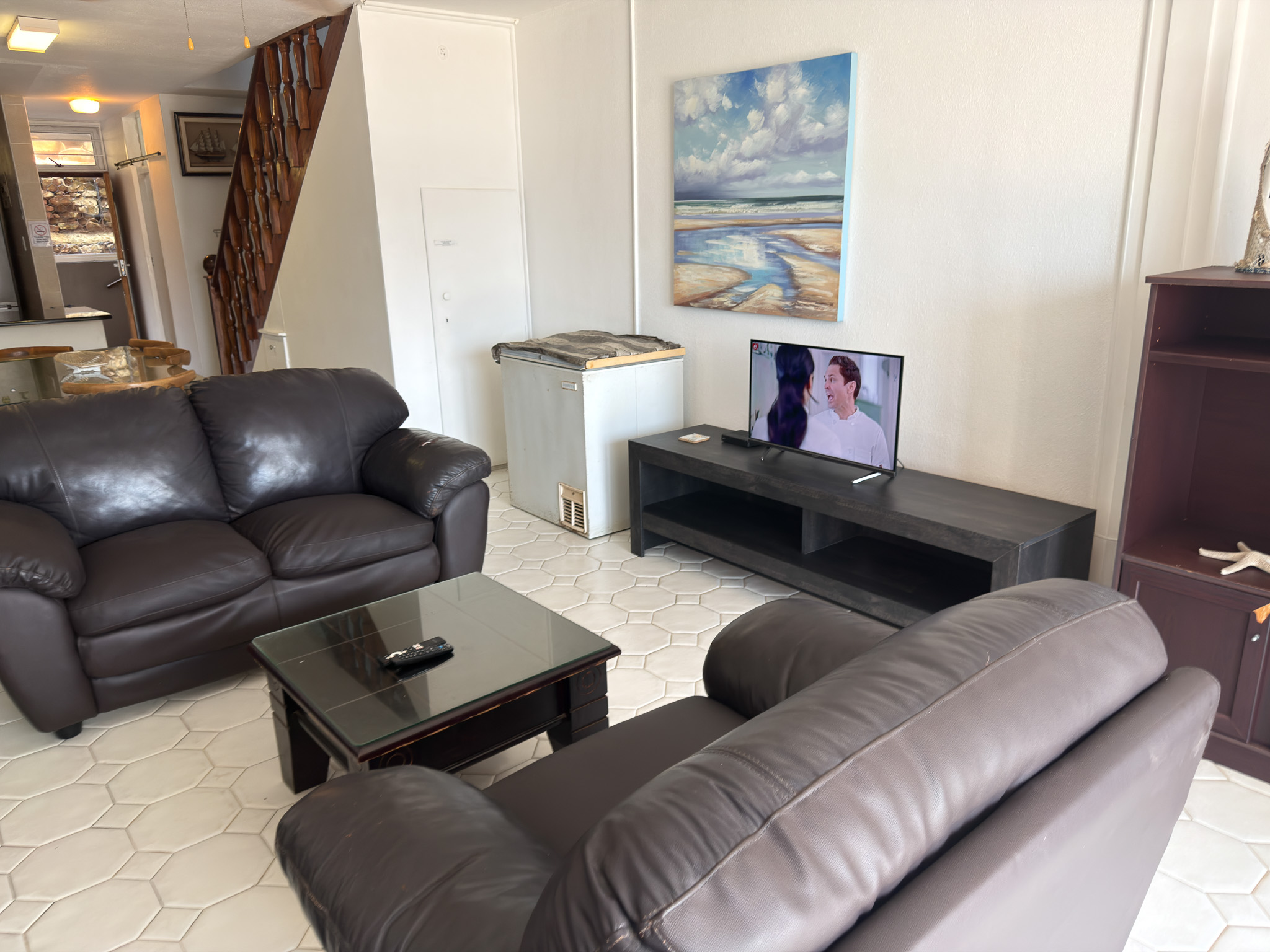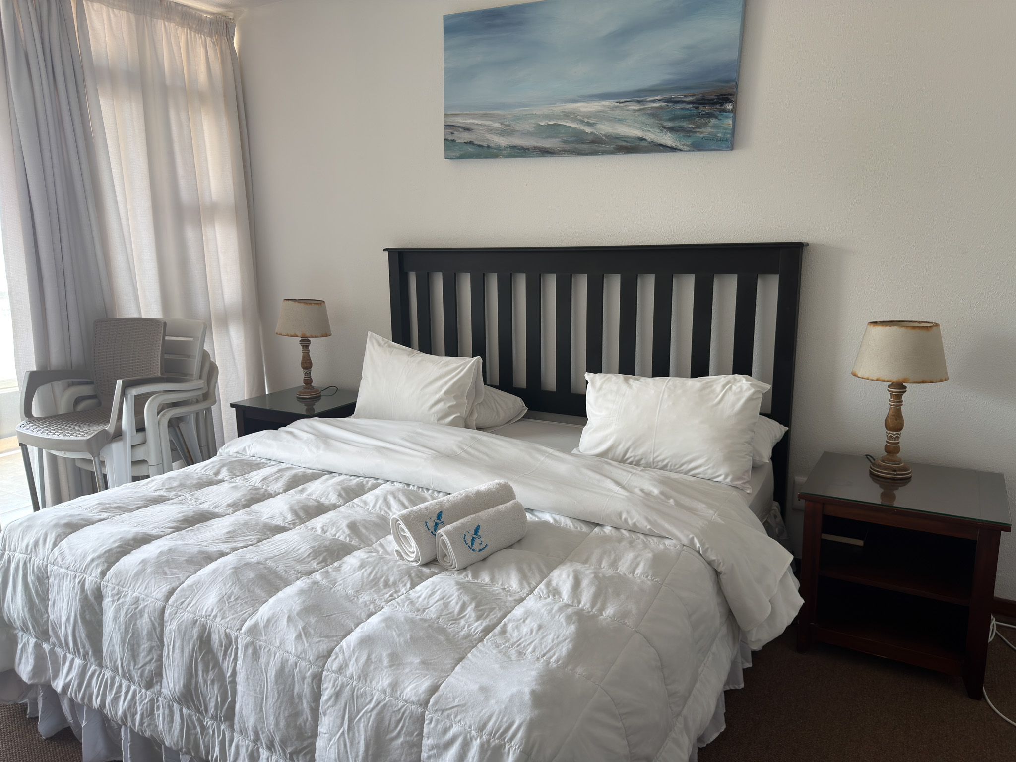 Individually owned and uniquely decorated 2-bedroom north-facing apartment on the ground floor at Inyoni Rocks Cabanas. Sleeps up to 6 guests. Features a fully equipped kitchen, DSTV & WiFi, private balcony, and en-suite main bedroom. All linen included.